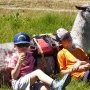 - Fly : grand lama lainé, gris argenté, à la laine particulièrement fine. Il est le lama câlin de la caravane.